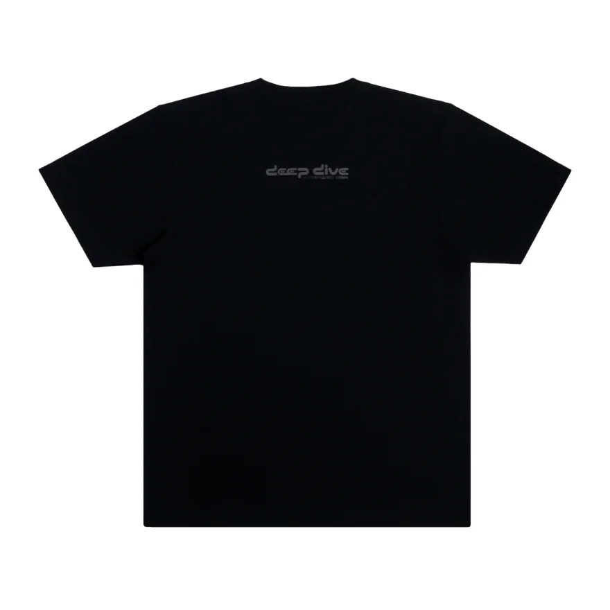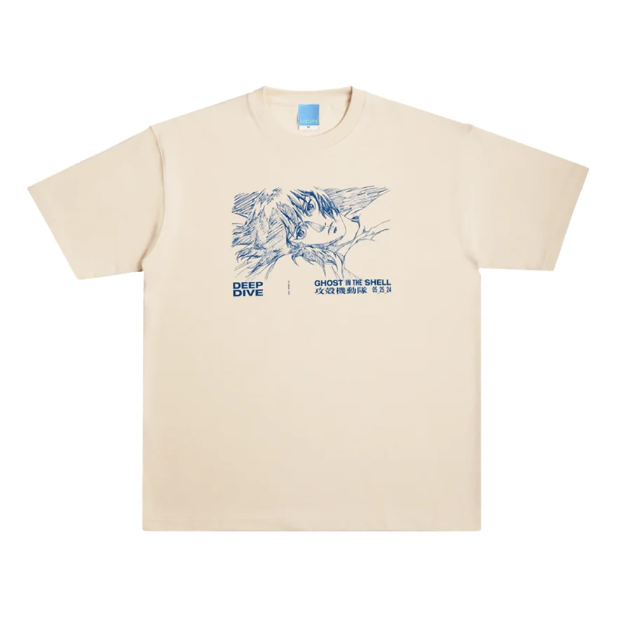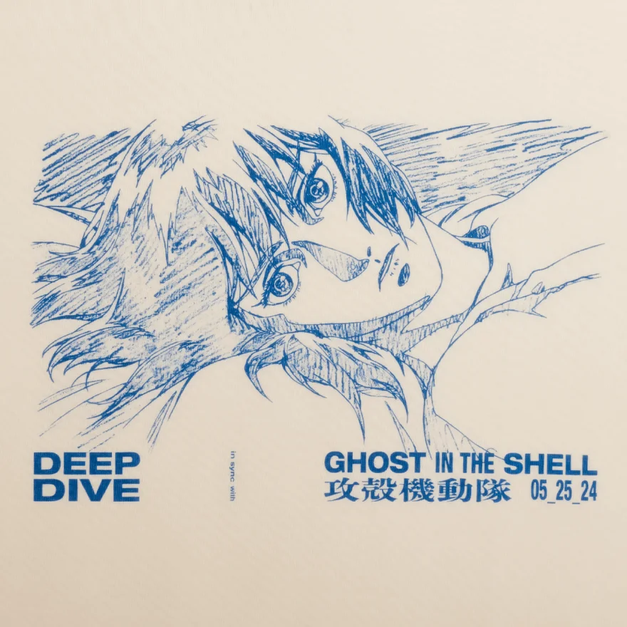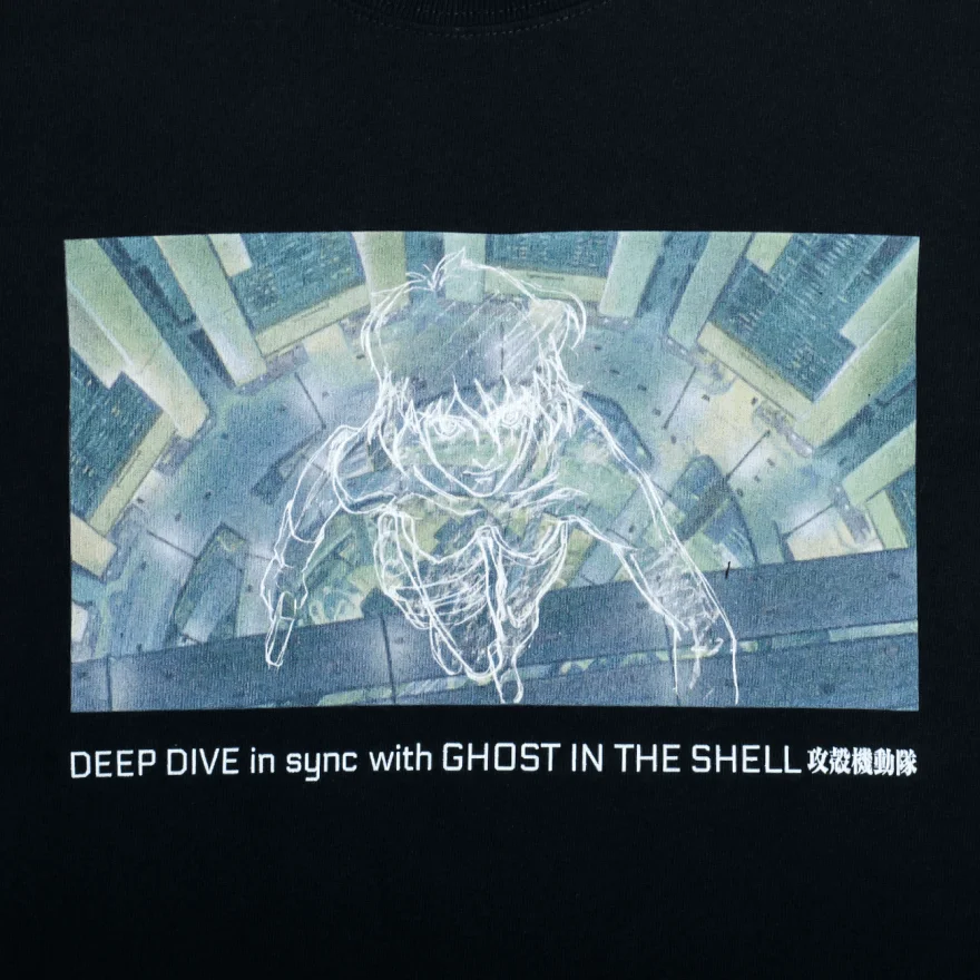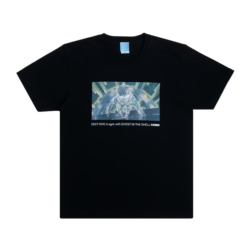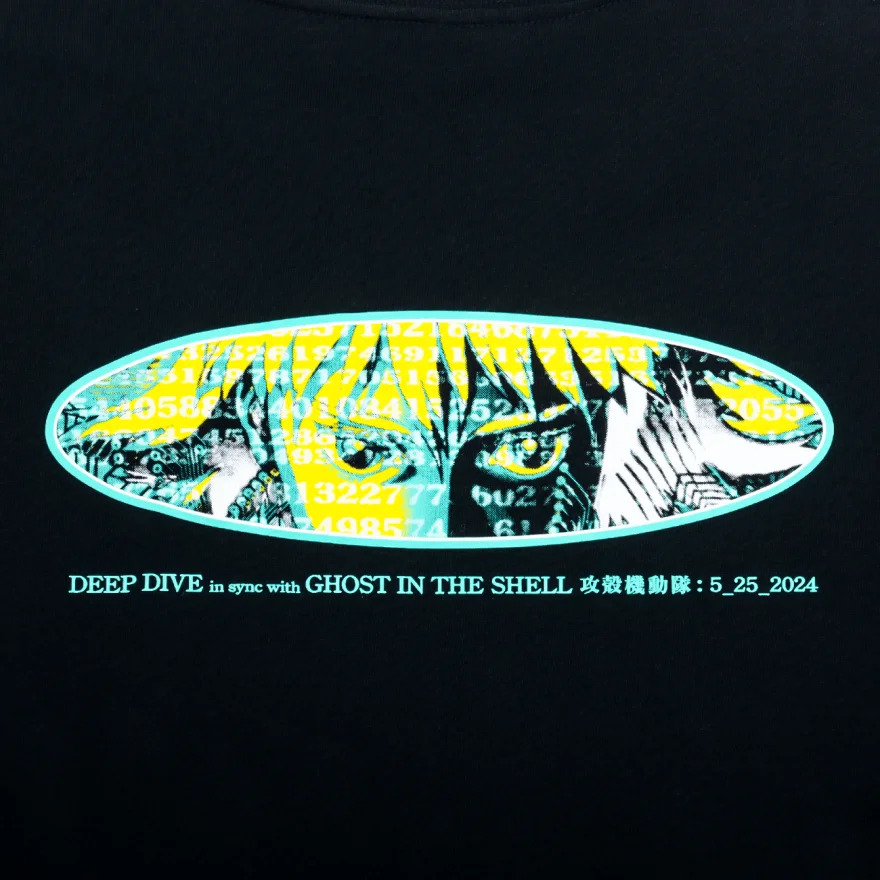 セーフハウスのベッドで目覚める草薙素子と、「DEEP DIVE in sync with GHOST IN THE SHELL / 攻殻機動隊」のイベントタイトルを組み合わせたデザインのT-Shirts。