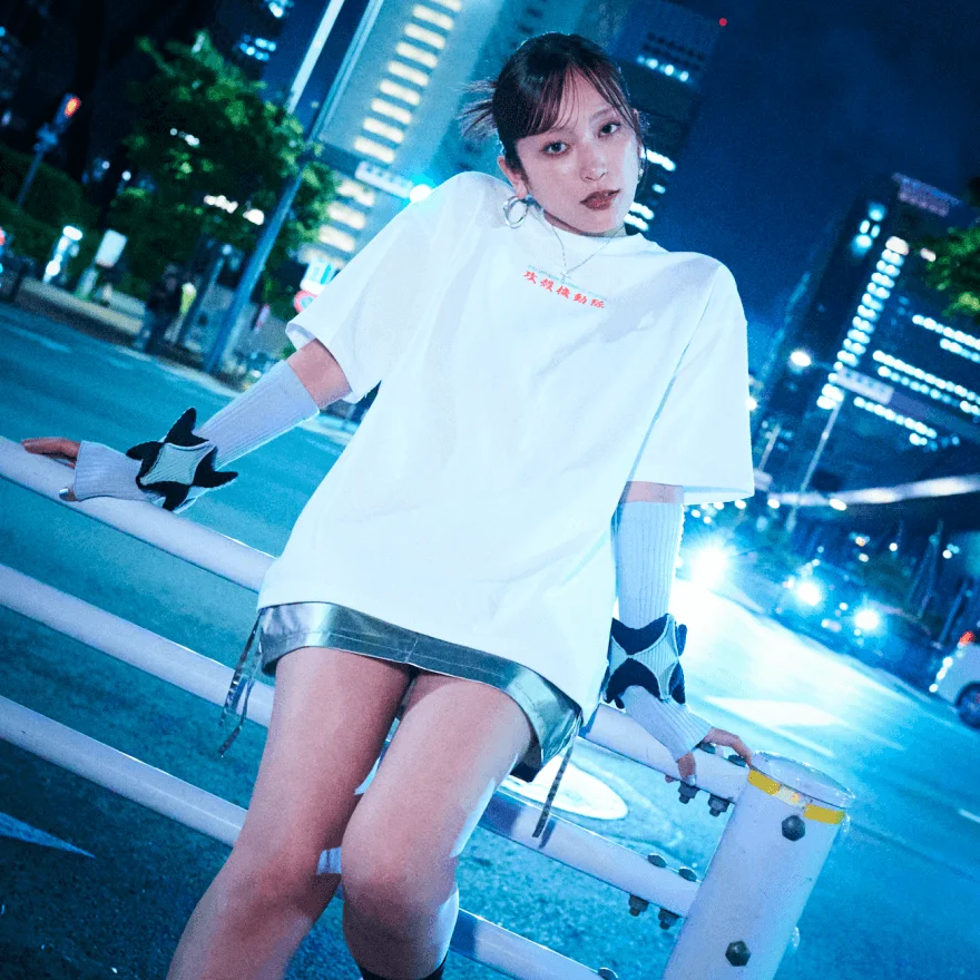 作品冒頭光学迷彩のシーンより。フロントには線画の草薙素子をあしらい、バックプリントをリフレクターにすることで、光学テクノロジーを表現したT-Shirts。