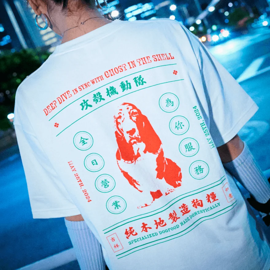 劇中の世界に登場するペットフードブランドを、ノスタルジックな中国の広告風にデザインしたT-Shirts。