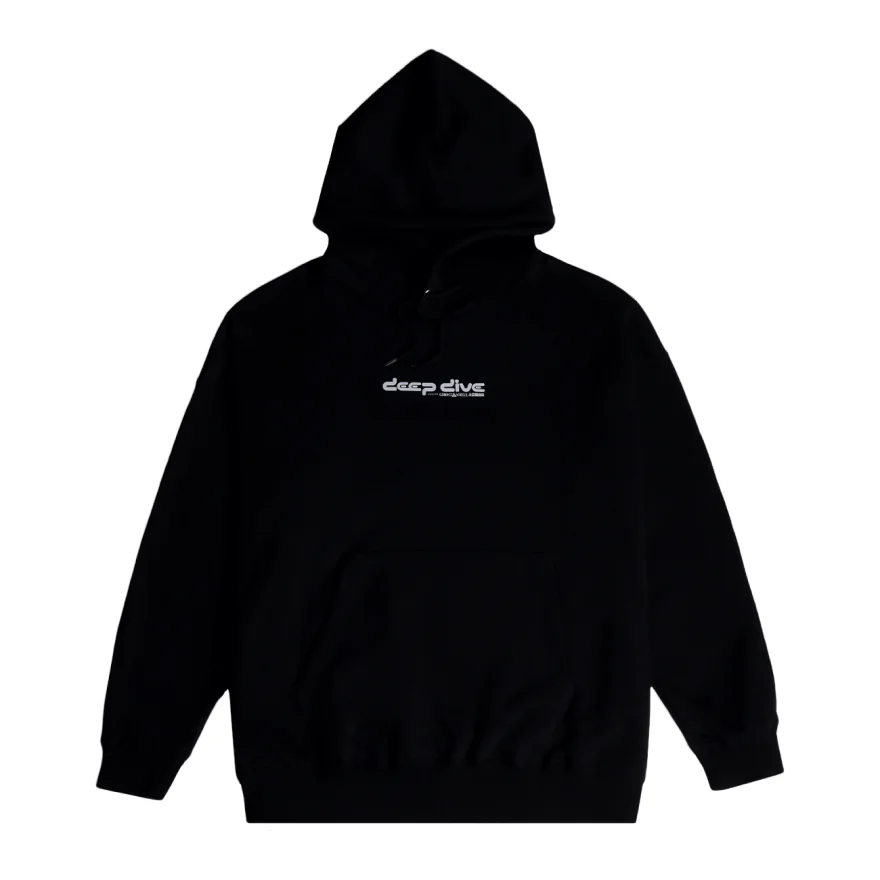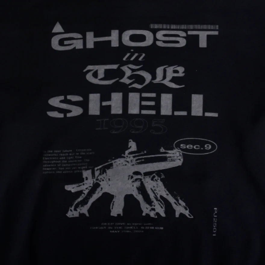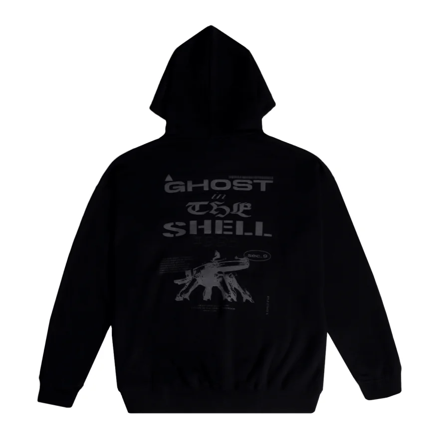 公安6課の「思考戦車」とその上に乗る草薙素子をタイポグラフィと組み合わせ、バックプリント左下の文章は映画冒頭の英訳文をデザインしたHoodie。