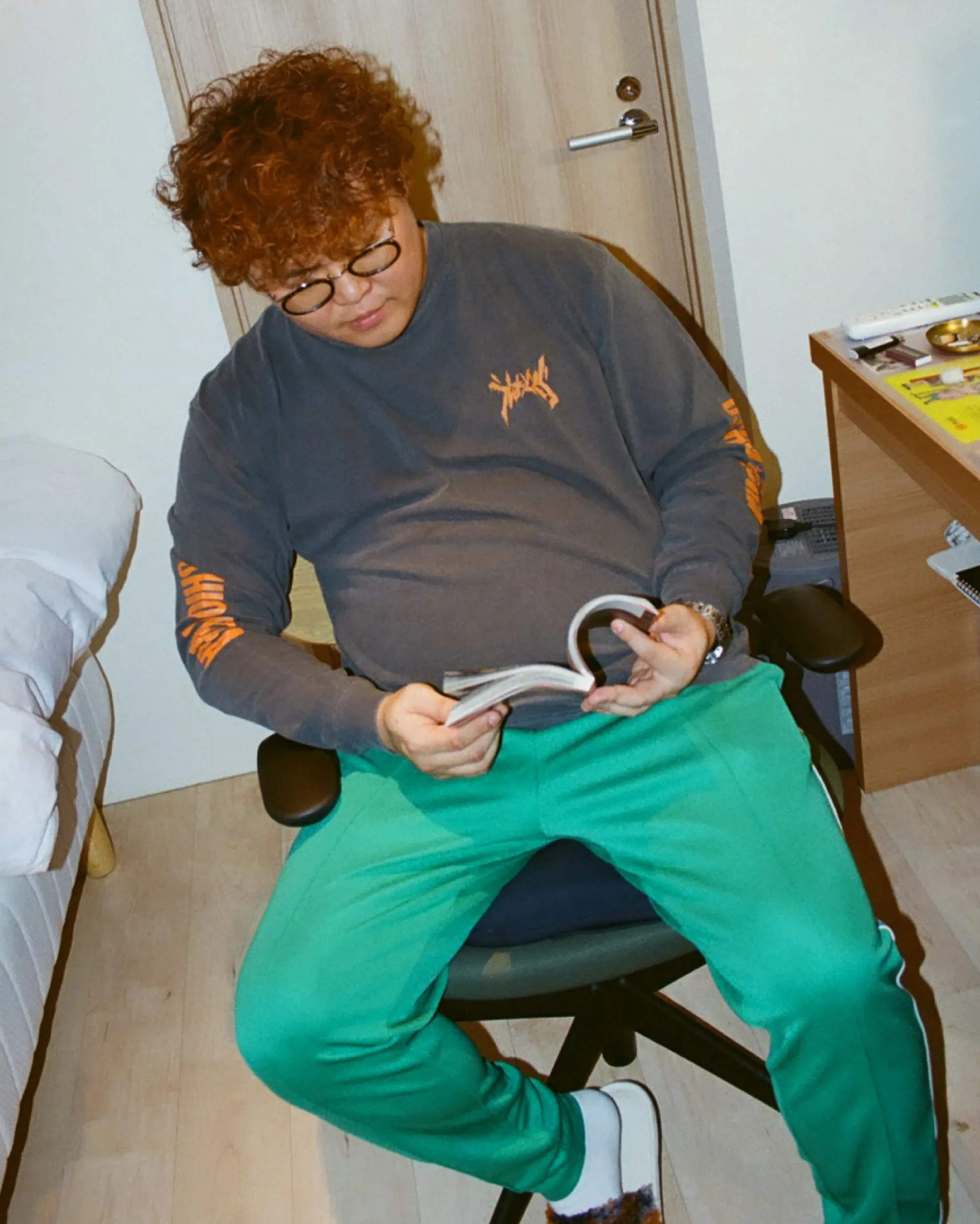 中谷:ロンTのベースが濃いグレーだったので、派手目なパンツを合わせました。実はこれ「LACOSTE」のジャージなんです。昔の体操着みたいなカラーが可愛くて。
