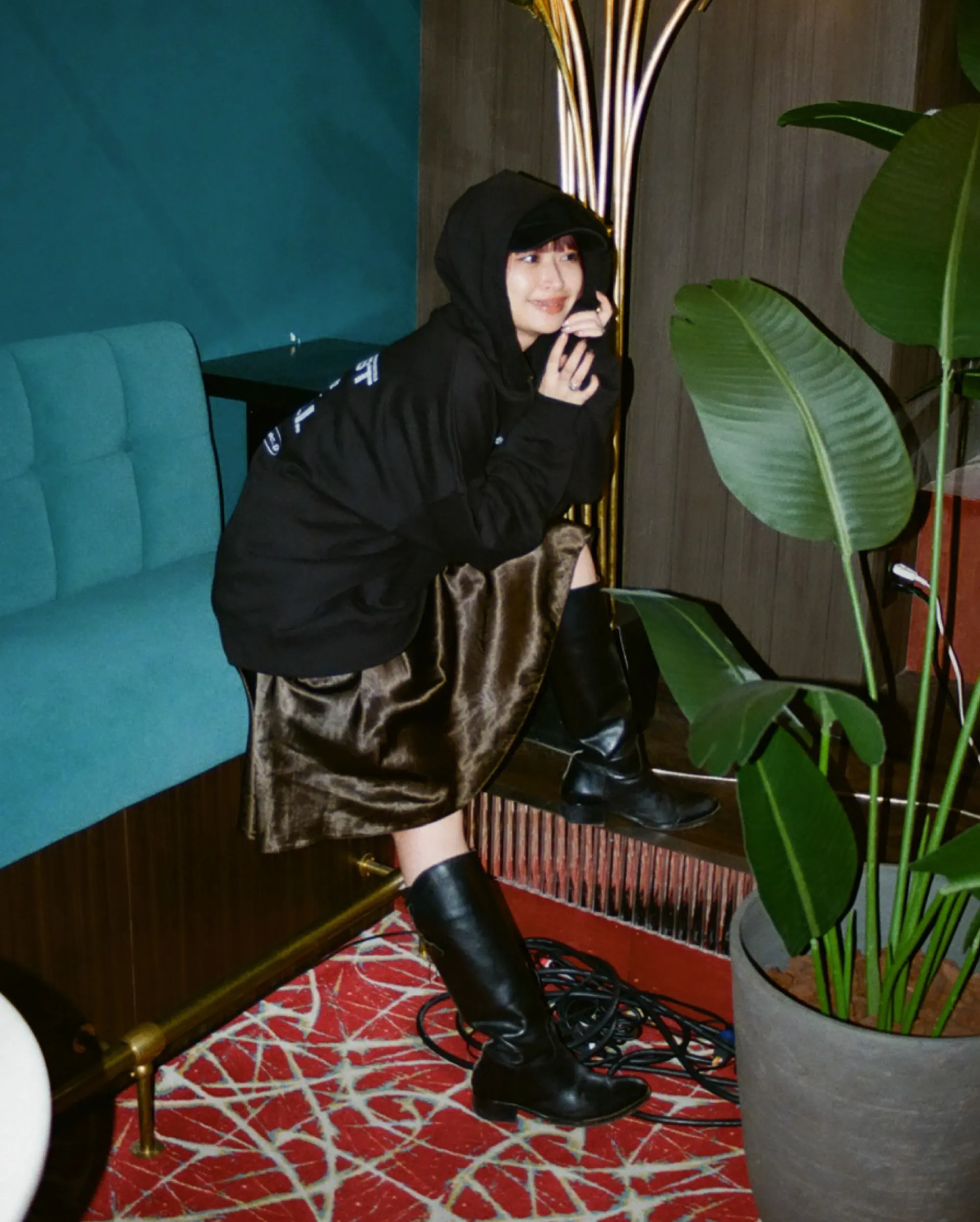 さくら:フーディーがかっこいいイメージだったので、サテンのワンピースをレイヤードして艶感のある女性らしい素材を加えました。さらにワンピースをブラウジングで丈を短くしてロングブーツを合わせてバランスを取りました。カジュアルすぎないないように、上品なアイテムを選んだのがポイントです。