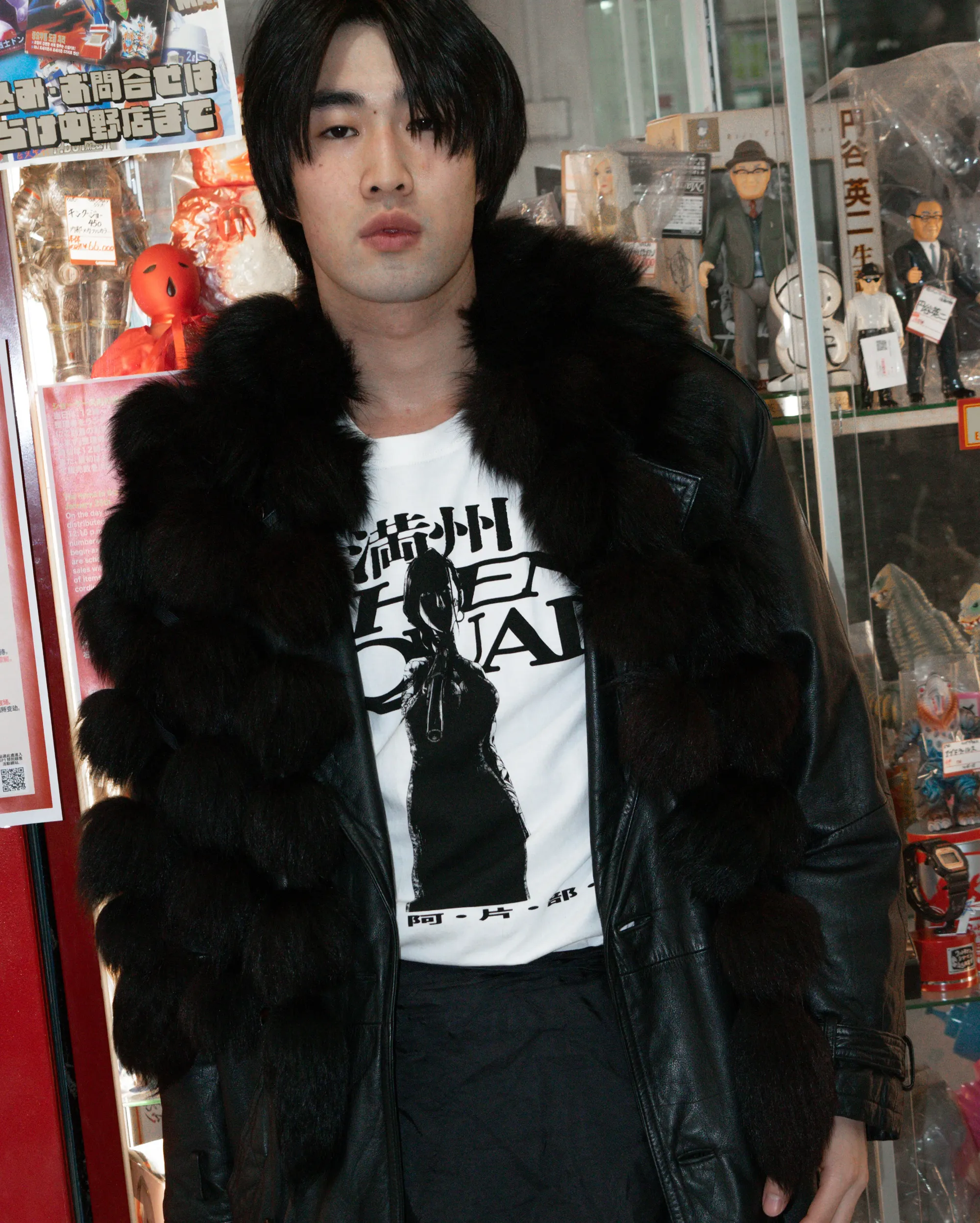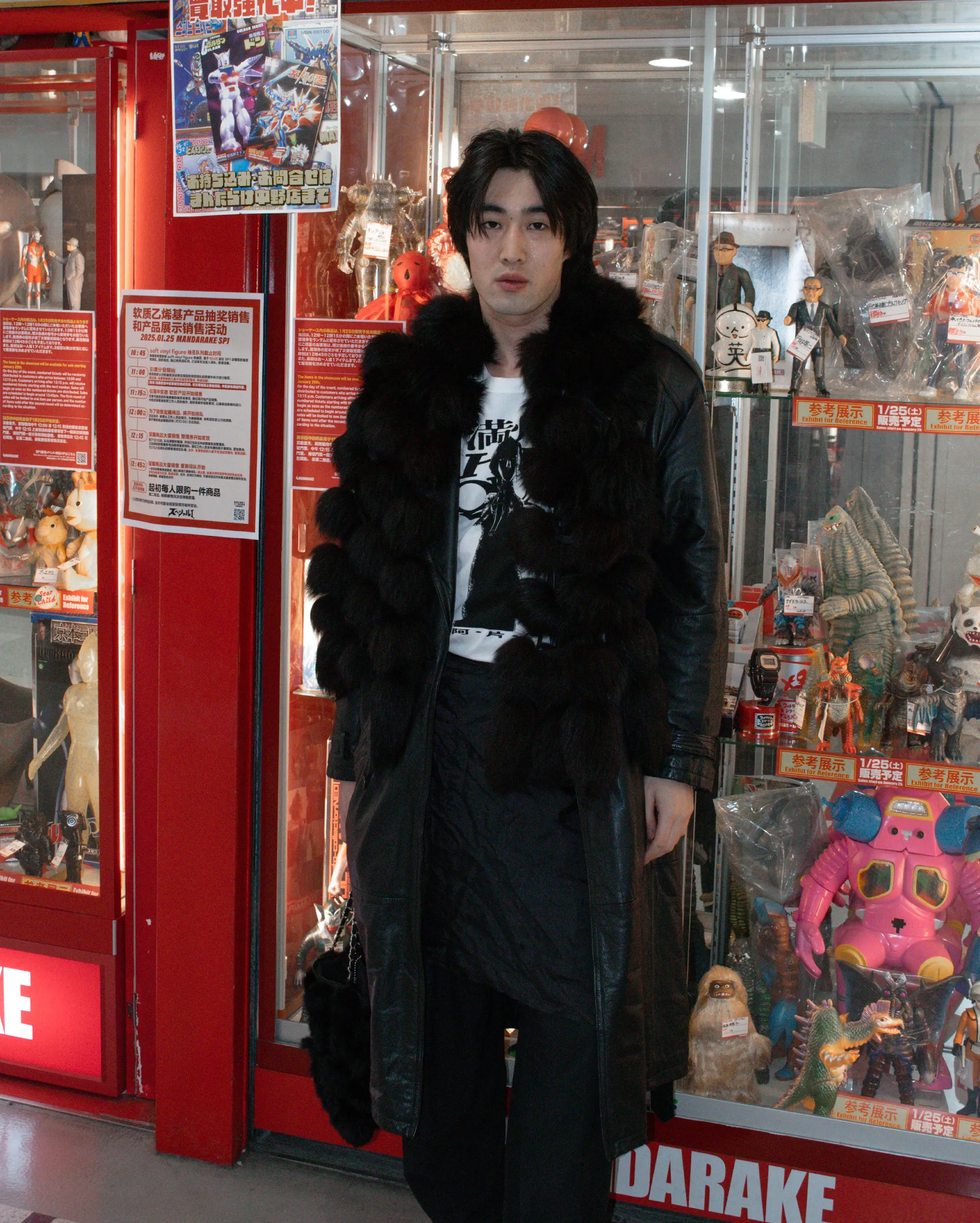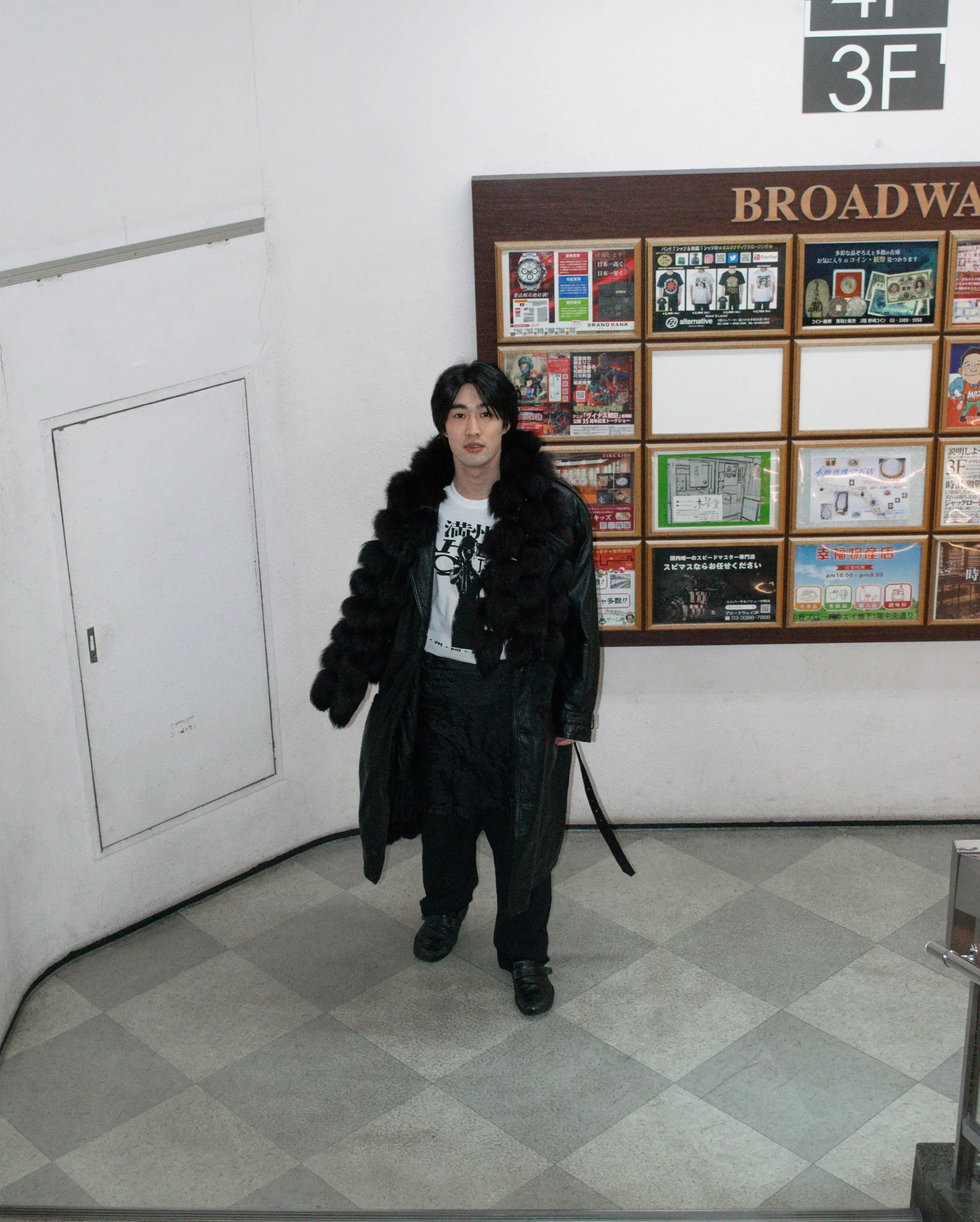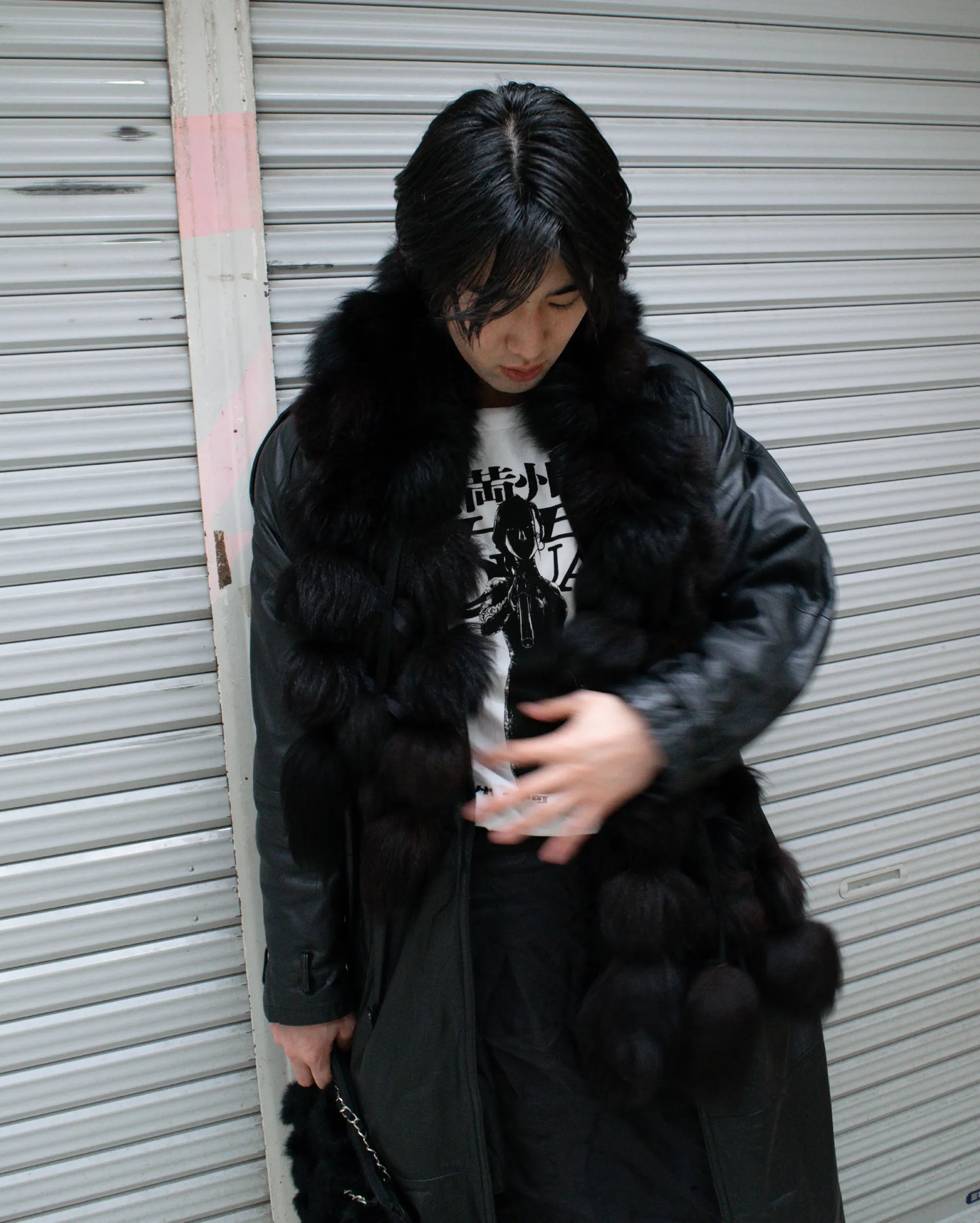 Takuma:今日は全部ヴィンテージです!このファーは陶芸をされているおばあちゃんが昔お召しになっていたもので、お皿を販売するついでにご自宅で売っていたものなんです。1000円で手に入れました(笑)