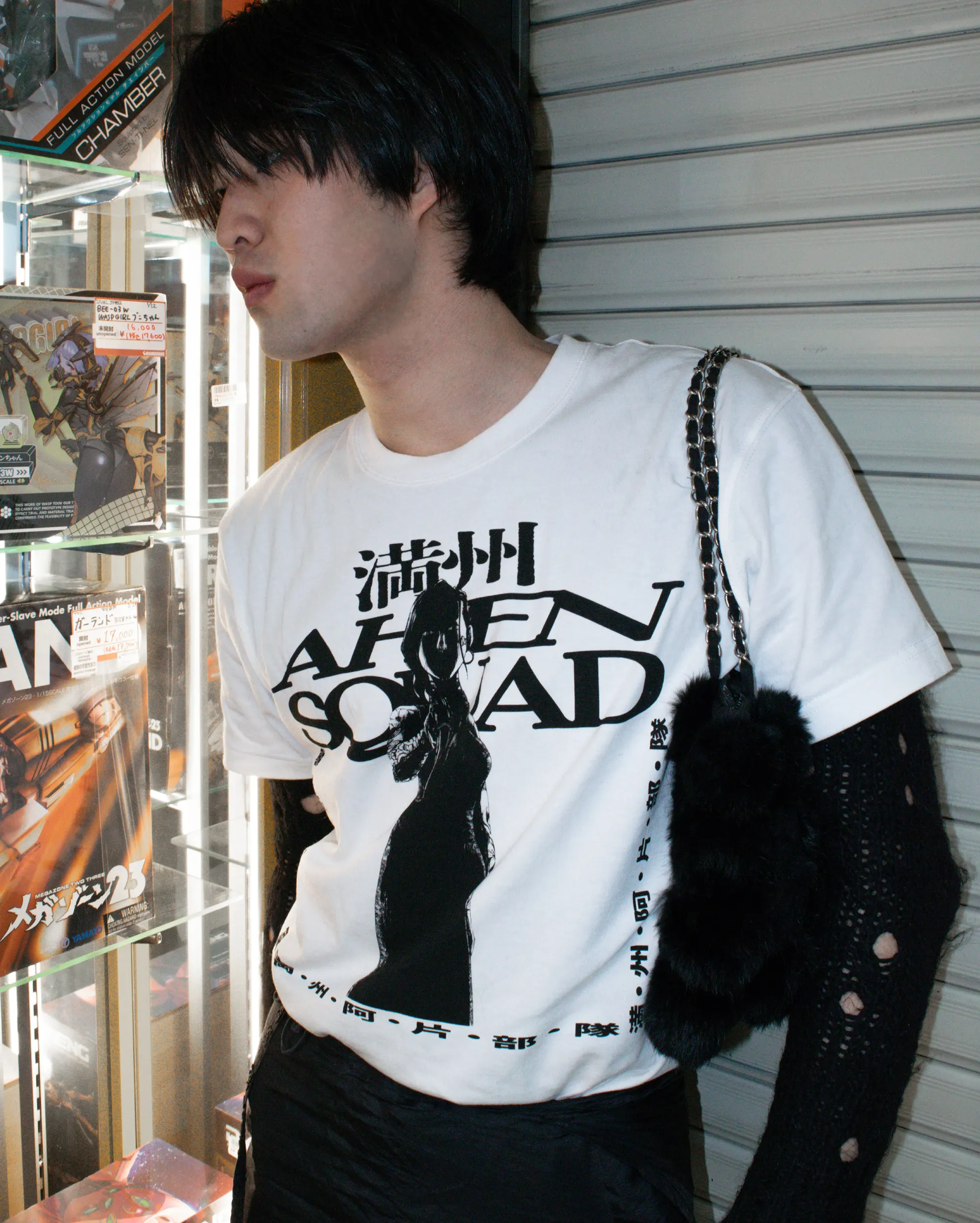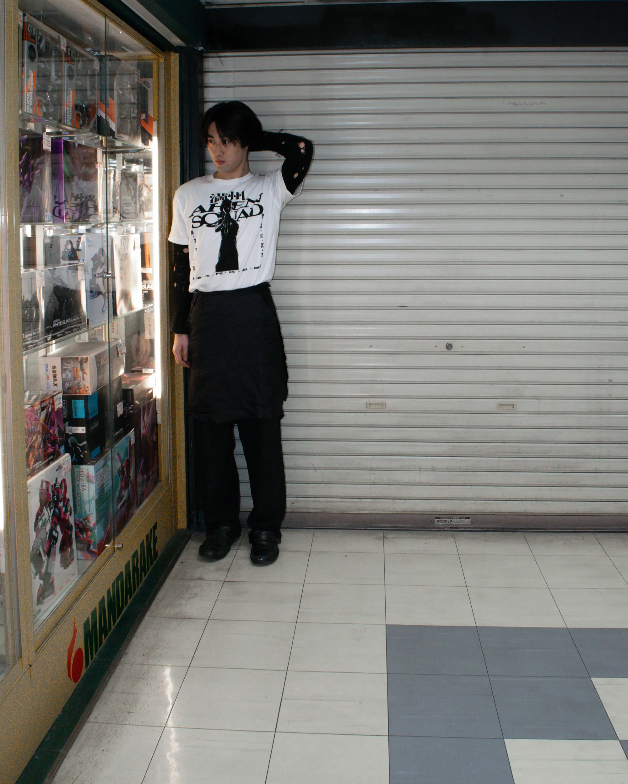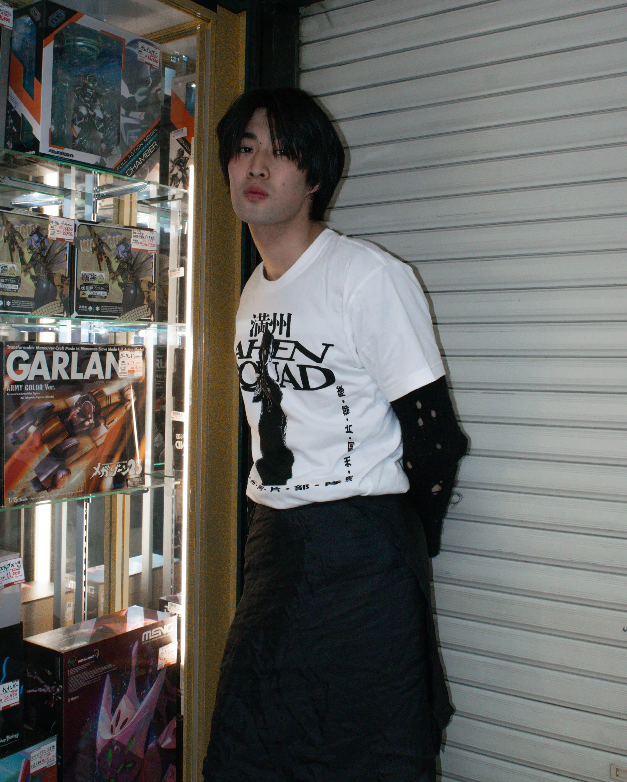 Takuma:冬だし、一応何か下に着ようと思ってロンTとか薄手のニットをレイヤードしてみたんだけど、なんか弱くてもっと重みが欲しかったんです。やっぱりボスだから、きつい感じとか、違和感のある感じにしたくて。だから普段だったらTシャツの下に入れないような厚みのニットを入れてみました。このMEQRIのTシャツは薄すぎないから、こういう厚みのあるアイテムを合わせやすかったです。