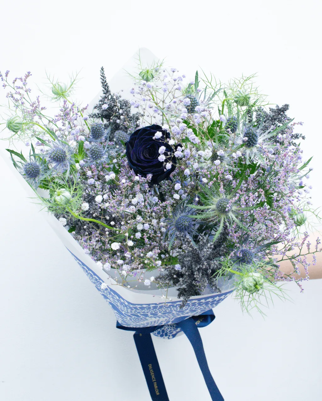 Lei:真ん中の黒紫のバラが目を引きますね。周りのお花とのバランスが儚さと強さを感じます。花束などを製作する際にこのように作品をイメージしたりすることはありますか?