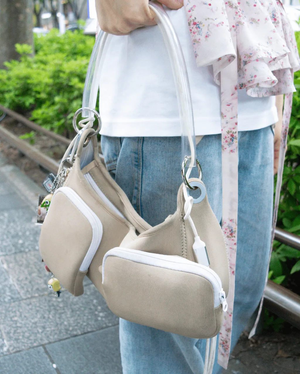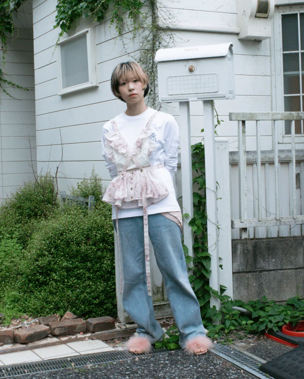 uwa:『犬夜叉』は戦国時代のお話なので、エプロンのシルエットを絞って袴や鎧を表現して、ファーサンダルは殺生丸のあの白い毛をイメージしています。バッグはハンドルがコードになっているんですけど、これはかごめや犬夜叉が現代から戦国時代にスナックや目覚まし時計とかを持ち込む、その違和感をスタイリングでも表現したくてこのバッグを合わせました。