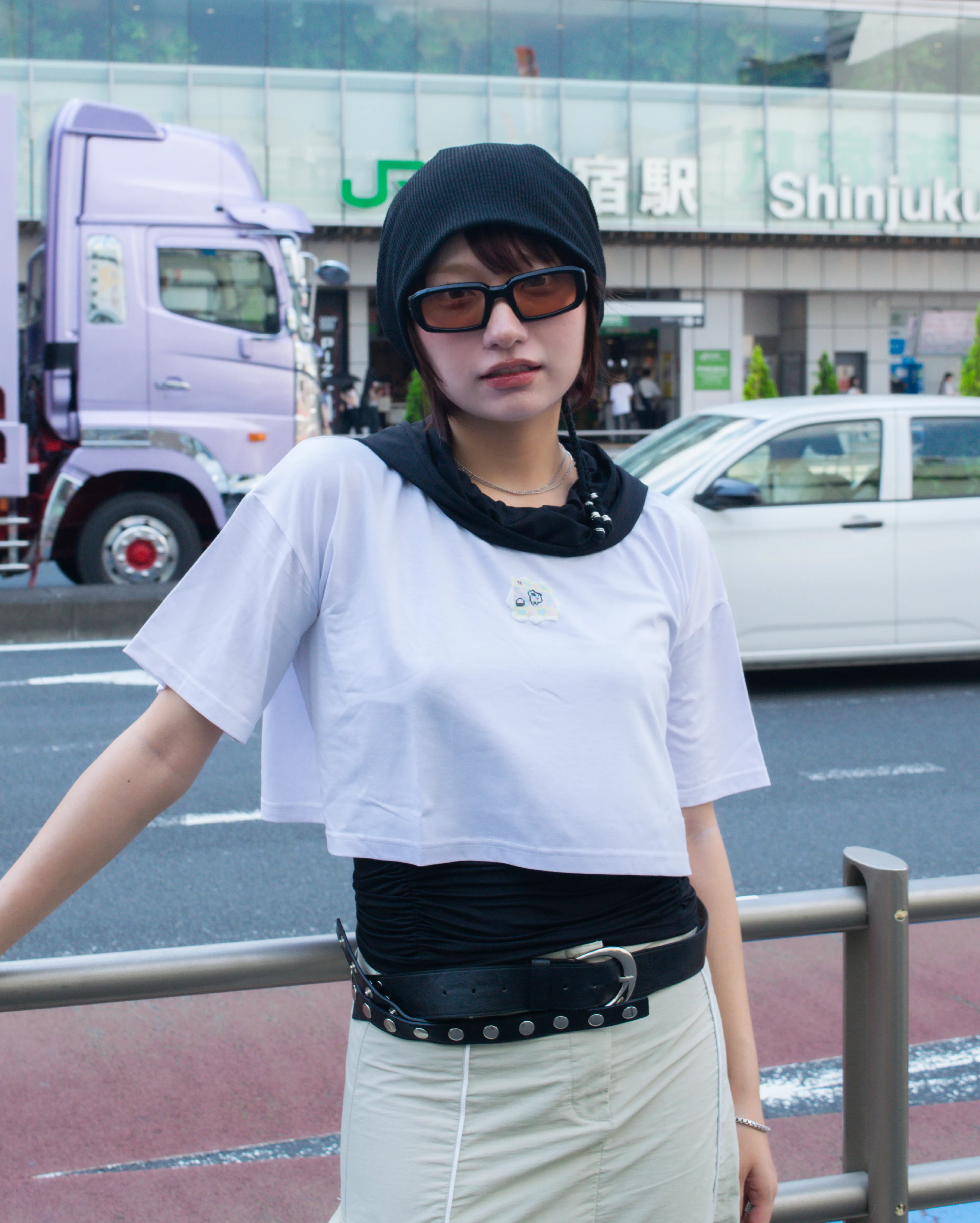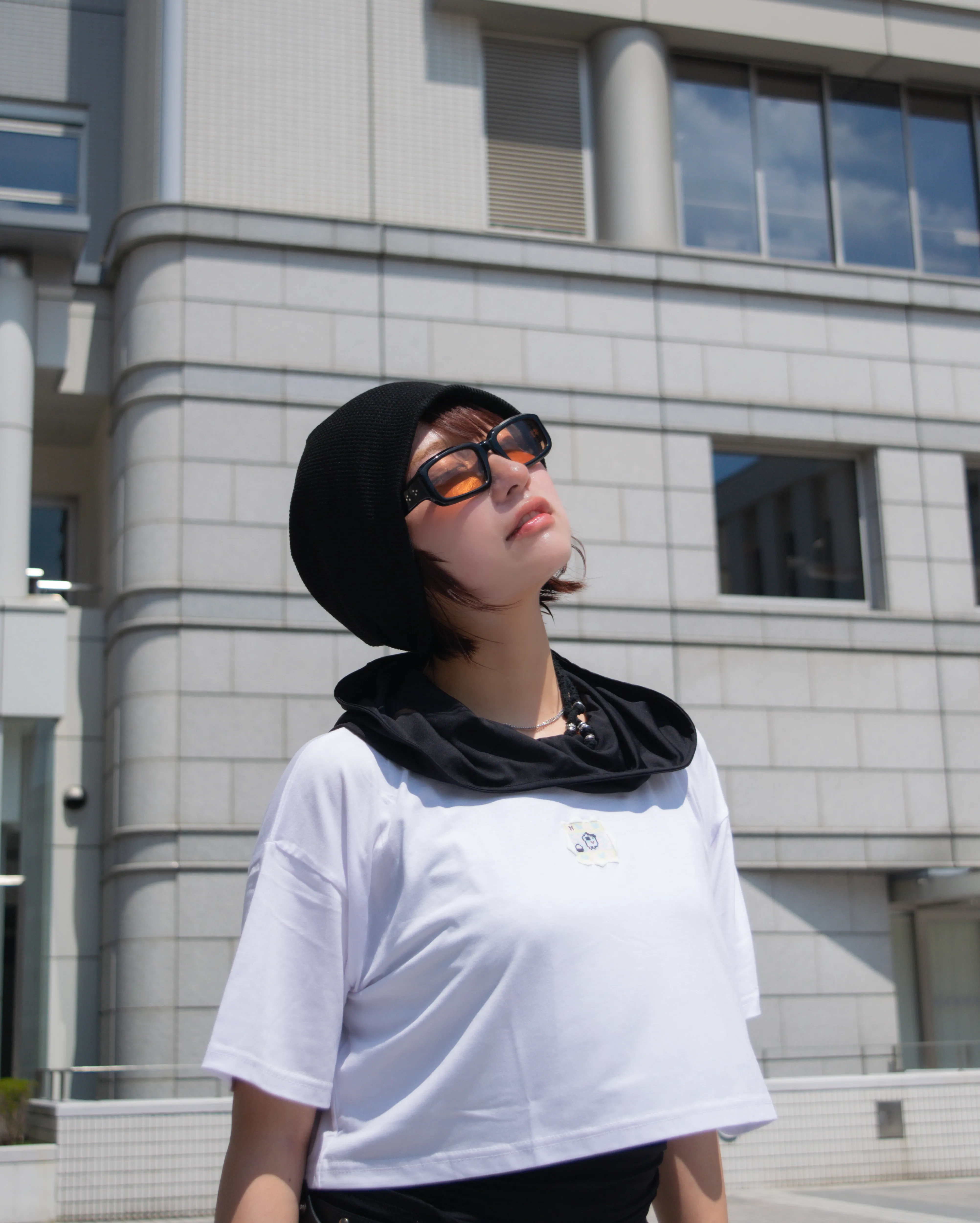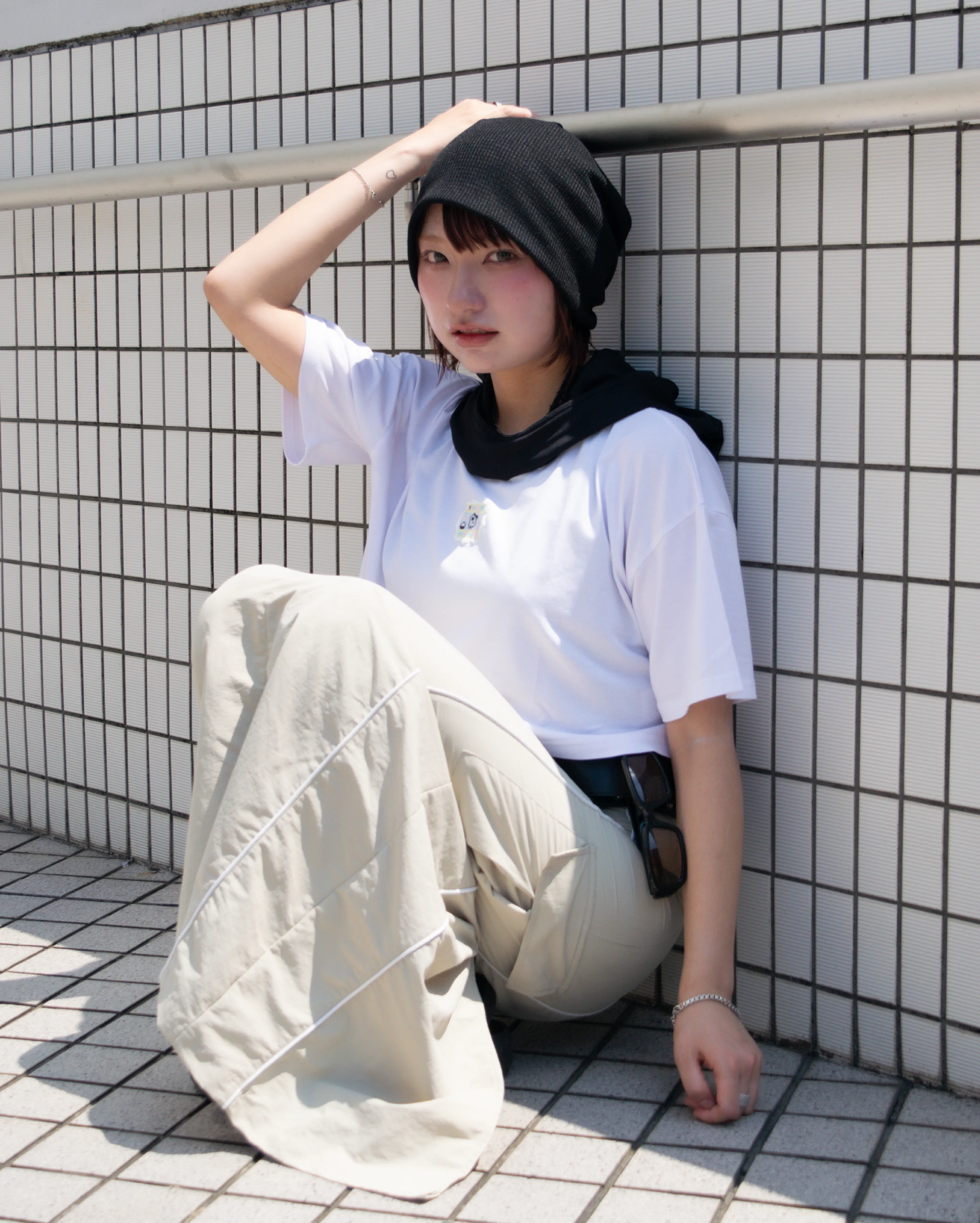 Uuy:レイヤードしてシンプルなTシャツの雰囲気を少し変えてみたことと、「たまごっち」のポテっと感を帽子と靴で表現しました!「たまごっち」といえばどちらかといえば暖色のイメージだったのでサンブラスのレンズでその暖色感を表現してみました。