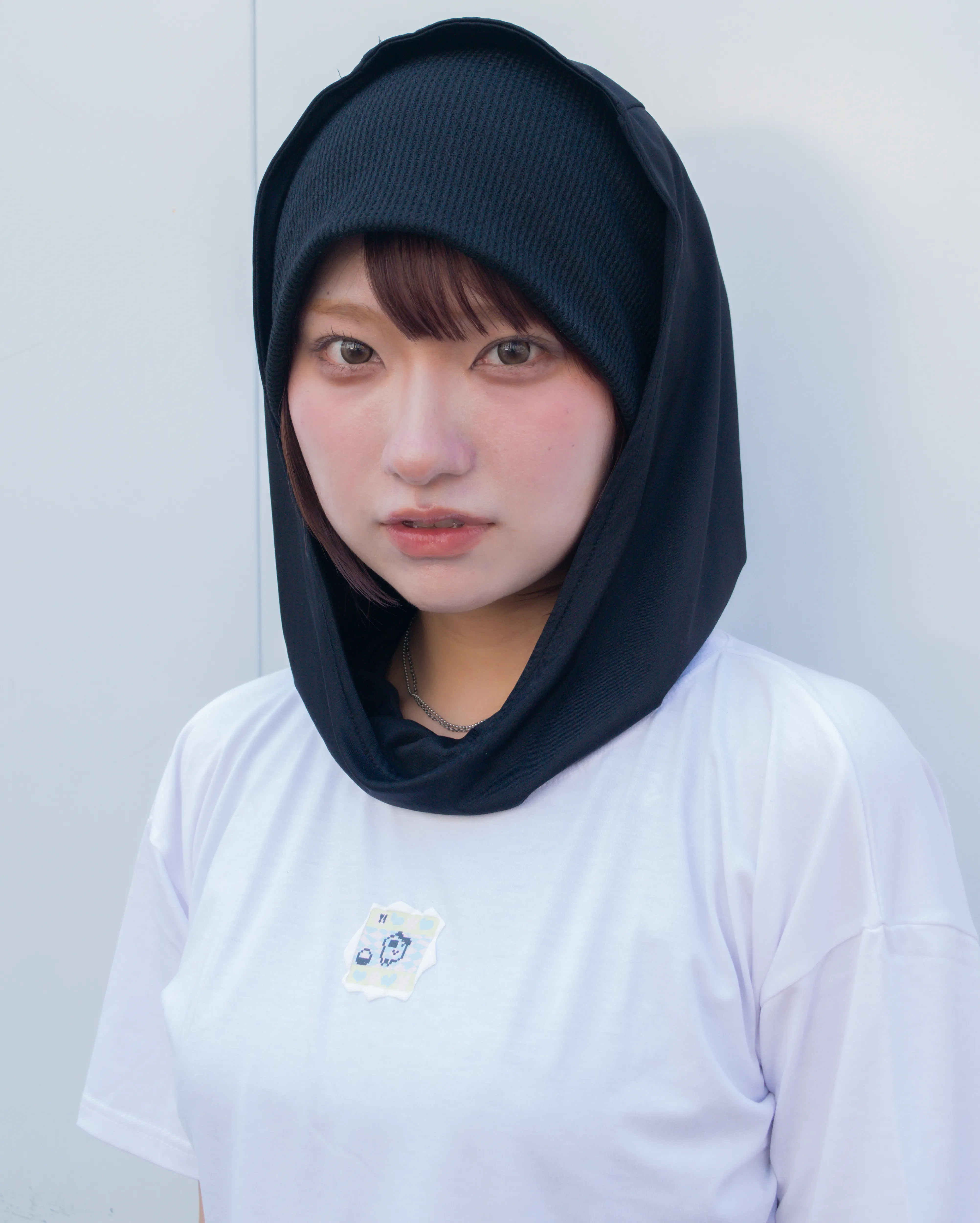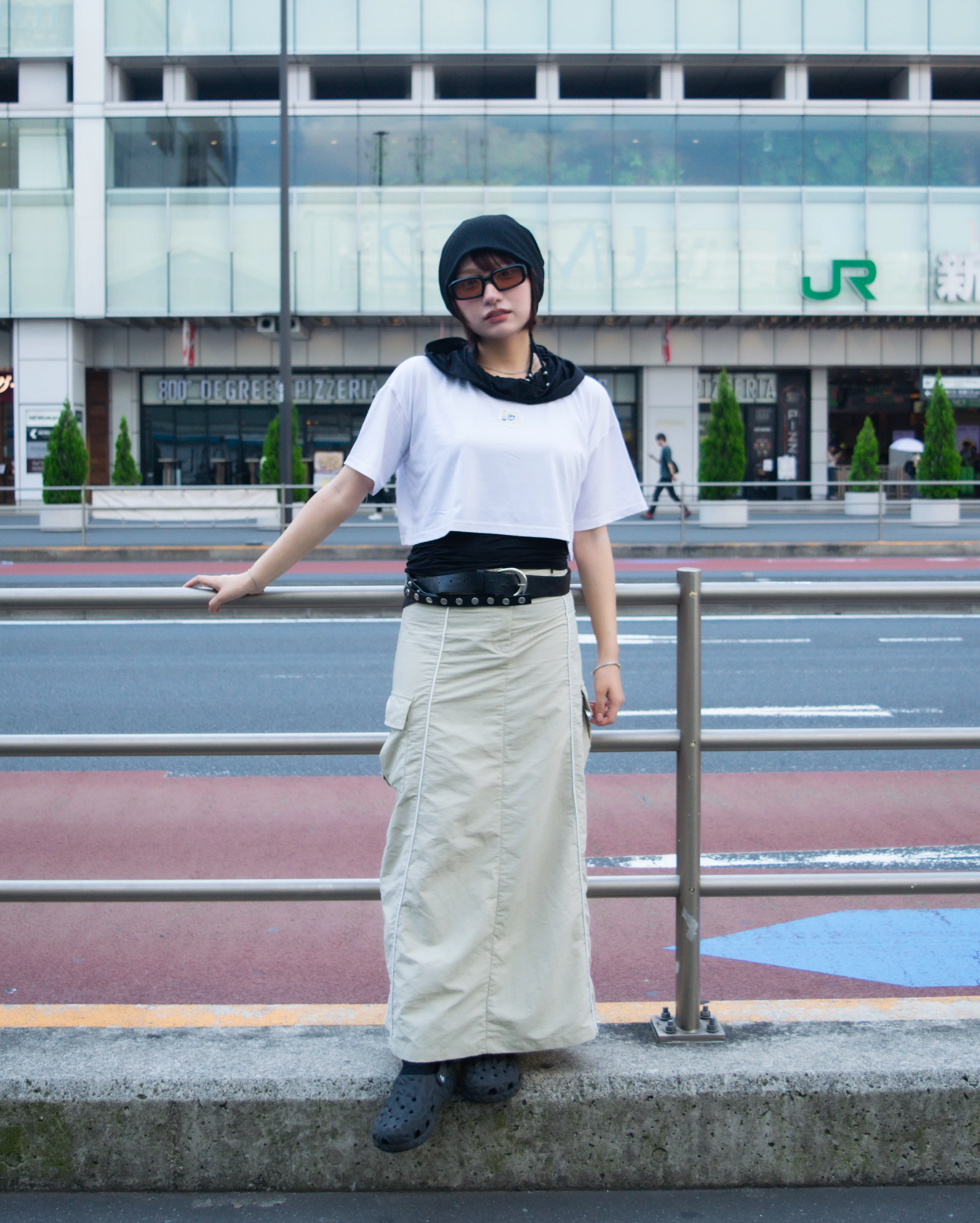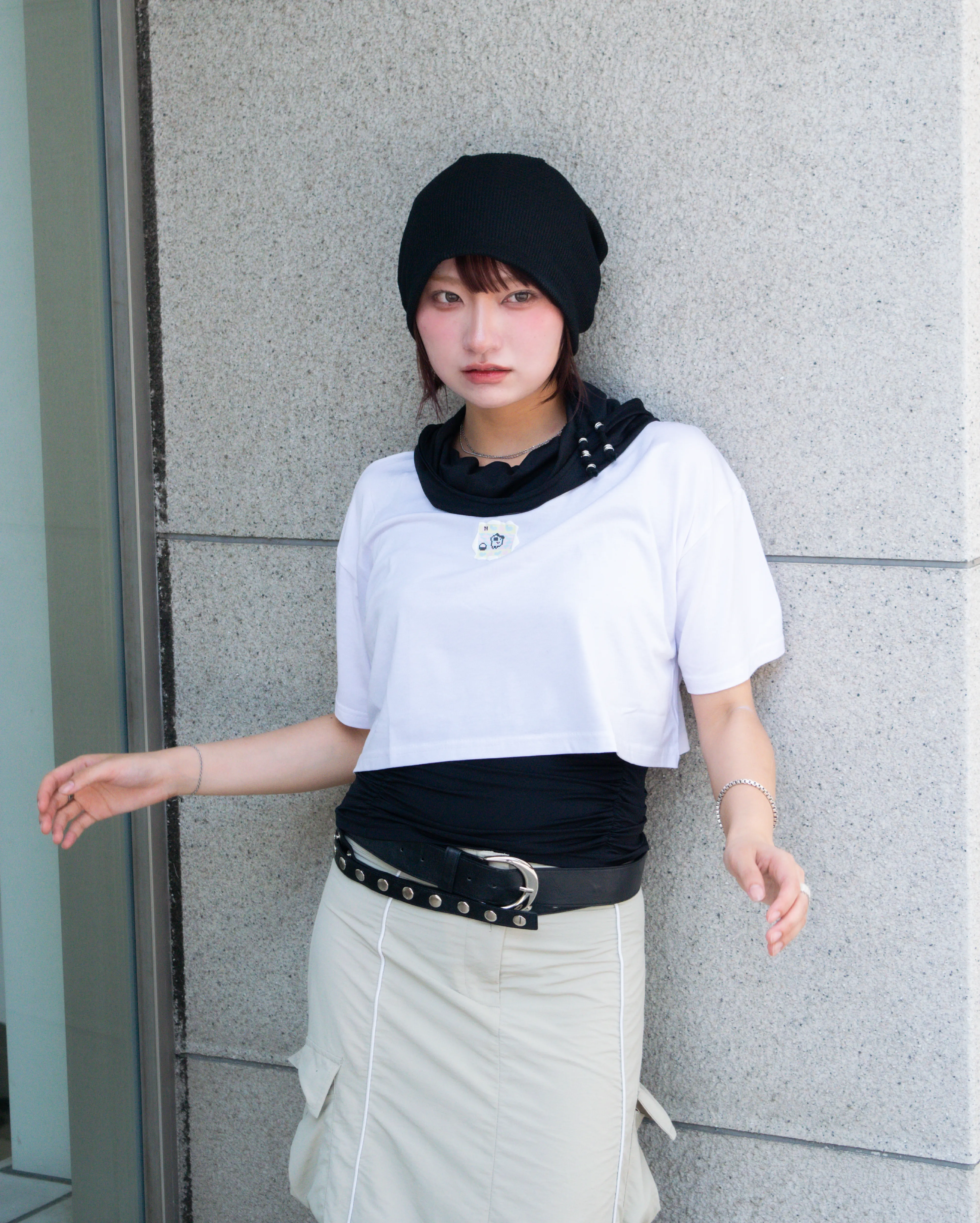 Uuy:レイヤードしてシンプルなTシャツの雰囲気を少し変えてみたことと、「たまごっち」のポテっと感を帽子と靴で表現しました!「たまごっち」といえばどちらかといえば暖色のイメージだったのでサンブラスのレンズでその暖色感を表現してみました。