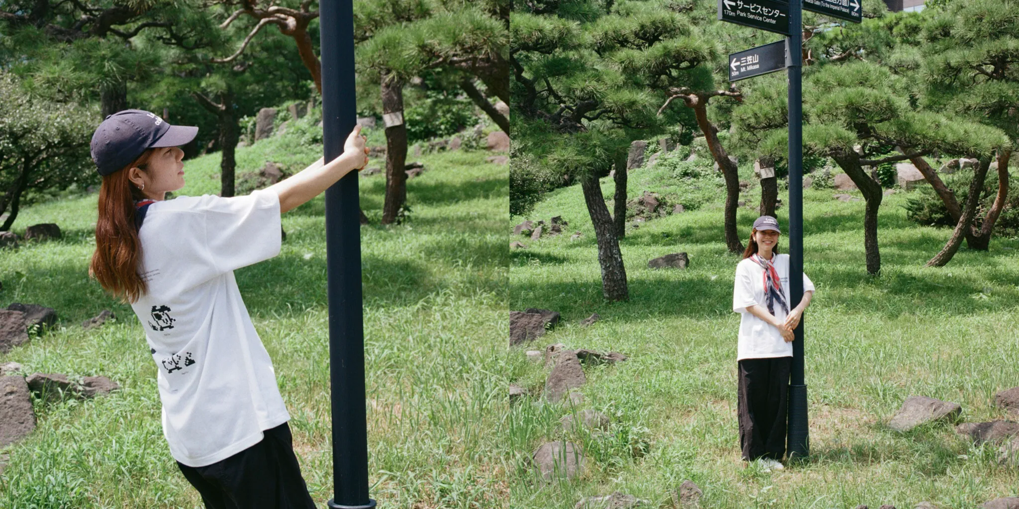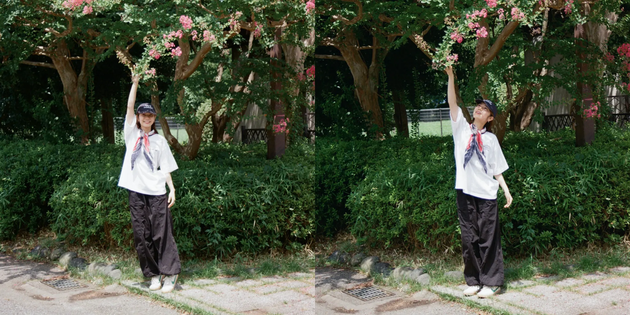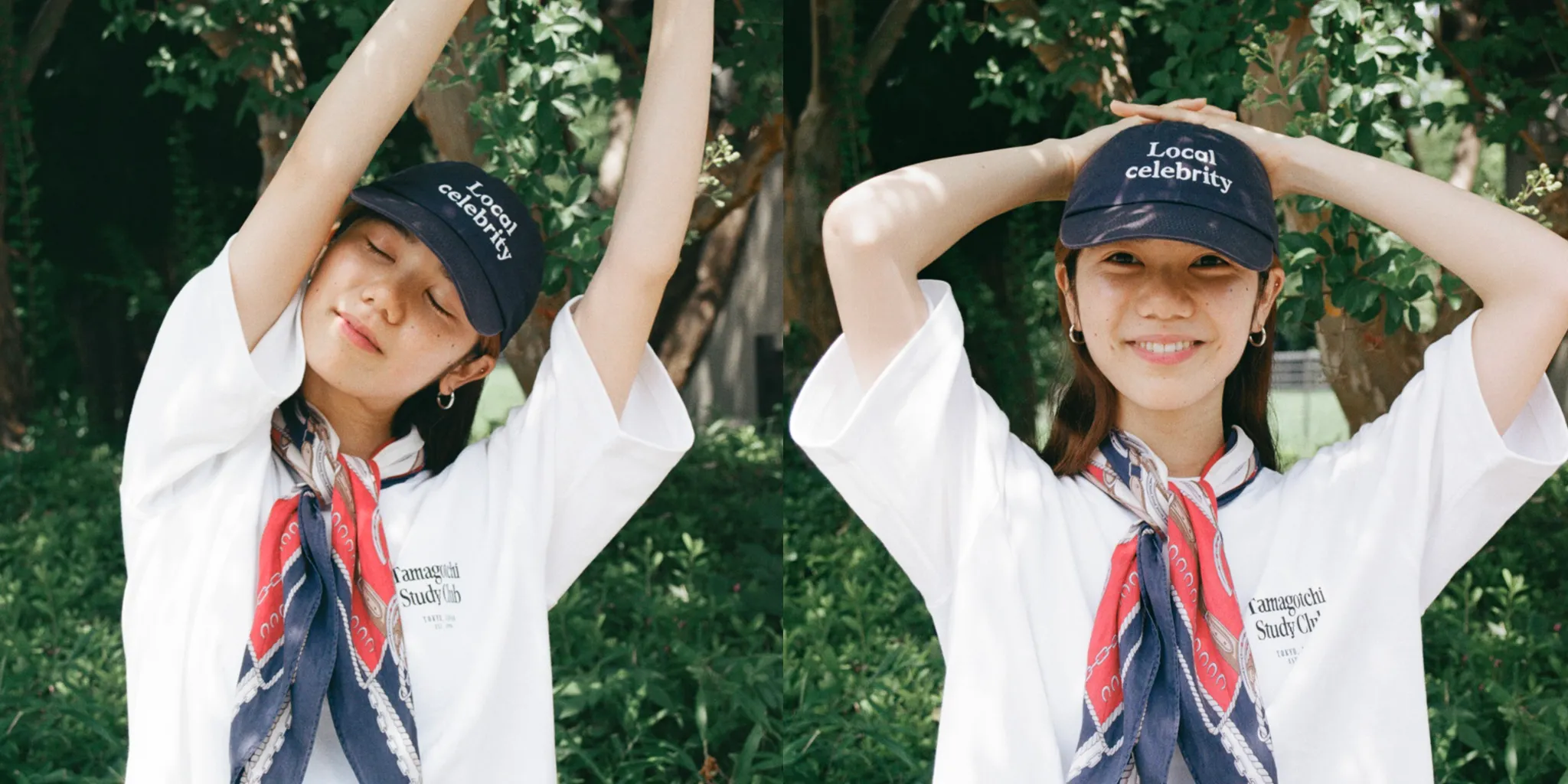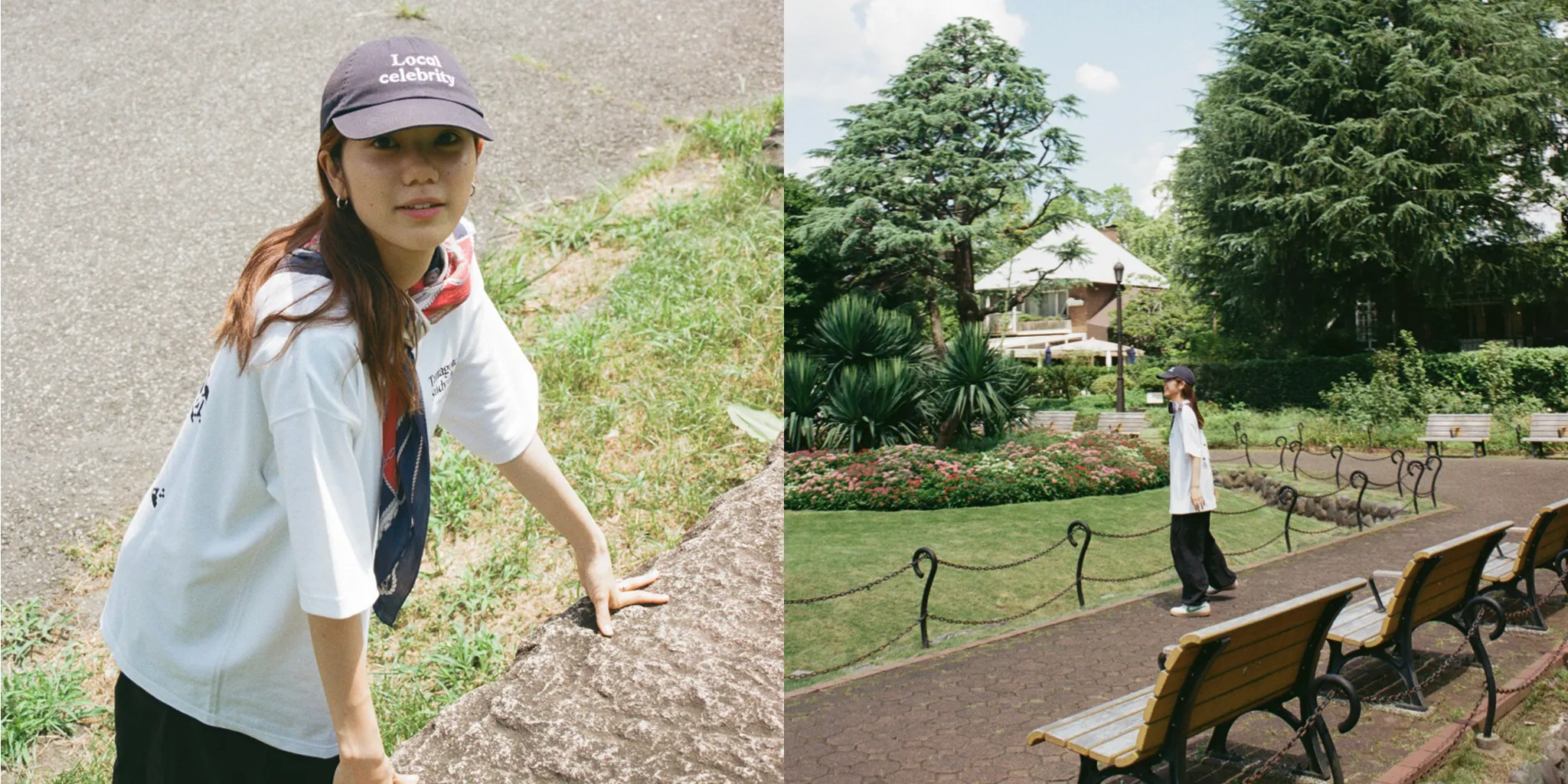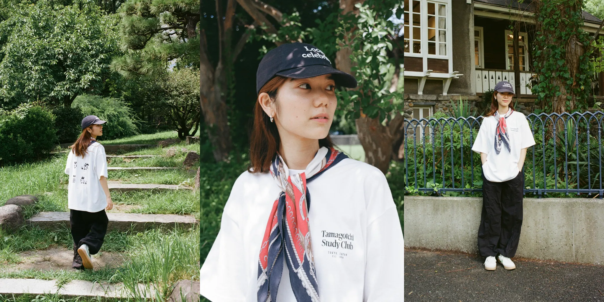 Tomoe:フェミニンな雰囲気にスポーティーなアイテムを合わせたりするのが好きで、今回はTシャツにナイロンパンツで動きやすいスタイルだけど、スカーフの可愛らしさでバランスをとったスタイリングにしたよ。