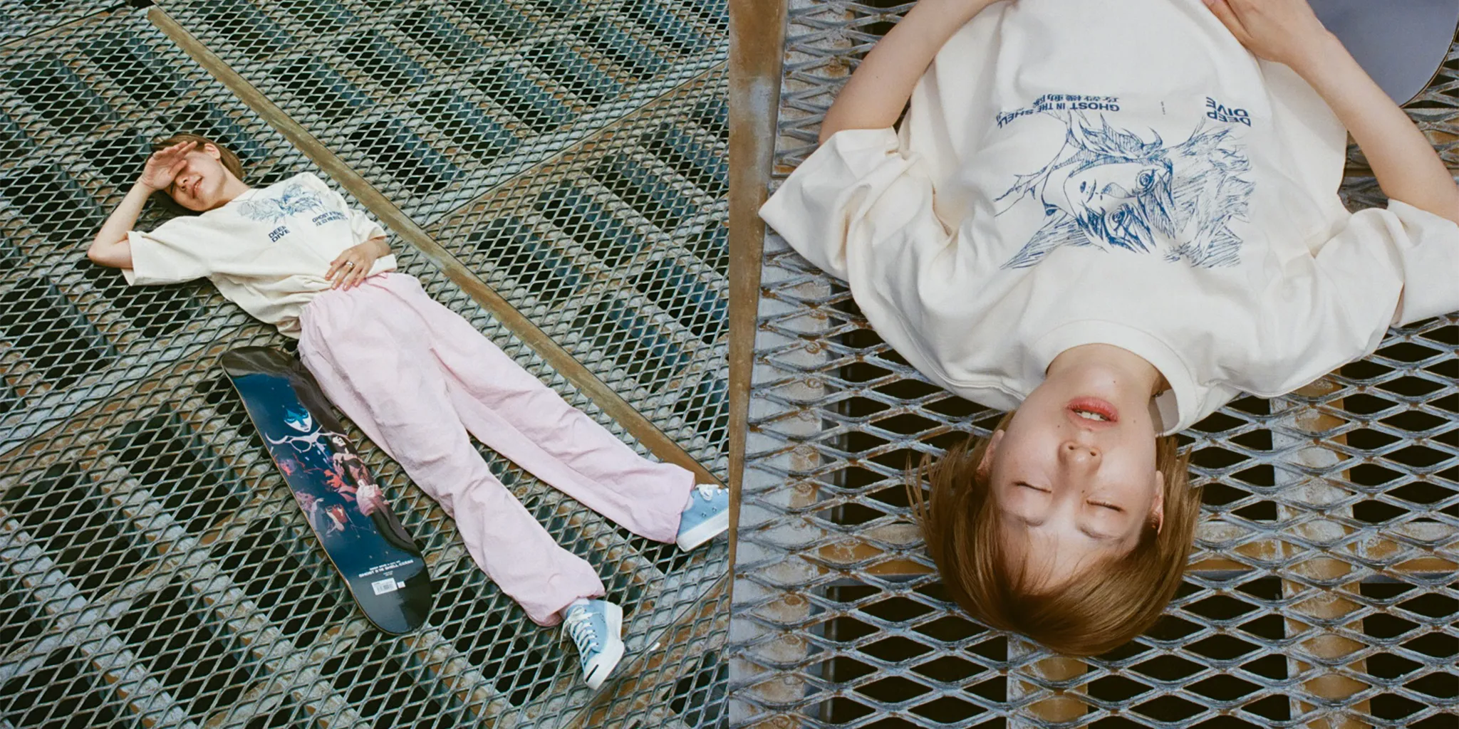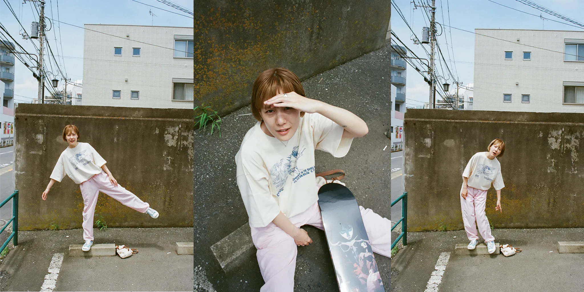 Ucary:しっかりめのコットン生地のTシャツに、いい青でデザインがプリントされていたので、それを活かしたくて。かっこよくというよりはフェミニンなスタイリングにしました!