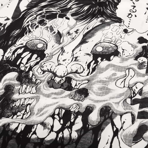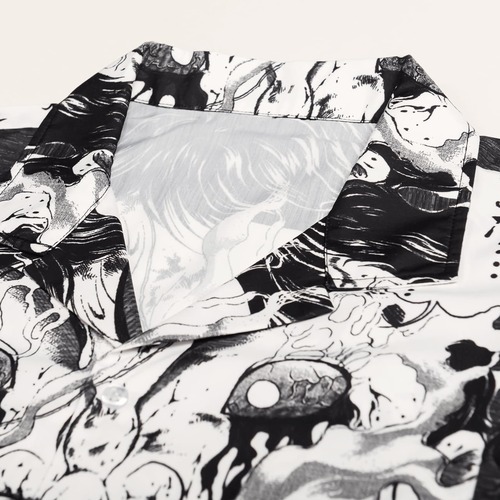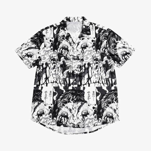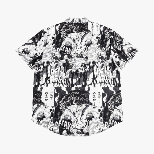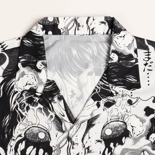 『バキ』最凶死刑囚編より、“花山 薫” VS “スペック“の名シーン「まだやるかい」を総柄プリントした開襟シャツ。