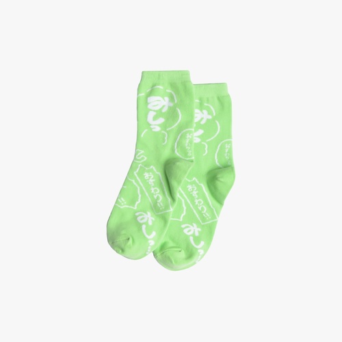 「おすわり」と「みしっ」のオノマトペを散りばめたデザインのSocks。