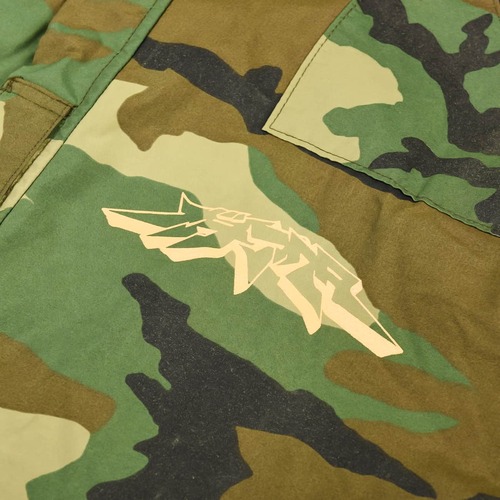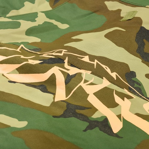 作品のグラフィティデザインを手がける晏童 秀吉先生が描き下ろした『ガチアクタ』のロゴを、シルクスクリーンプリントでヴィンテージアイテムにあしらった、一点物のMilitary Jacketです。