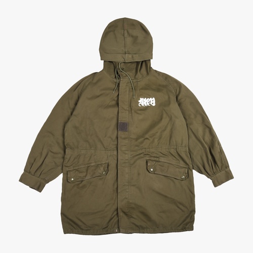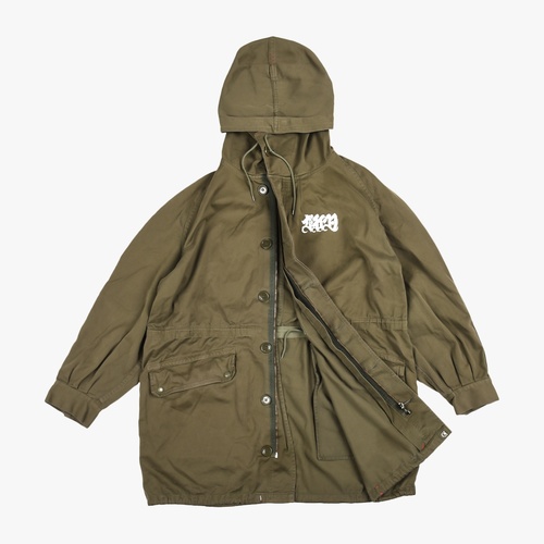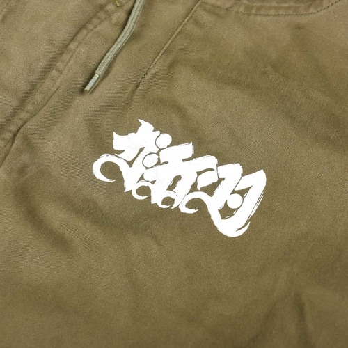 作品のグラフィティデザインを手がける晏童 秀吉先生が描き下ろした『ガチアクタ』のロゴを、シルクスクリーンプリントでヴィンテージアイテムにあしらった、一点物のMilitary Coatです。