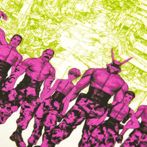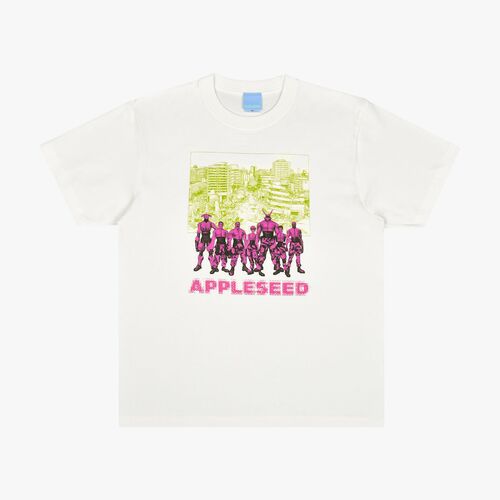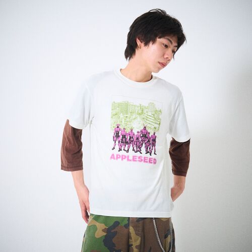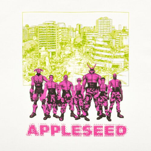 APPLESEED のキャラクターの設定画と、戦闘で壊された街風景を描写した漫画コマを合わせたT-Shirts。